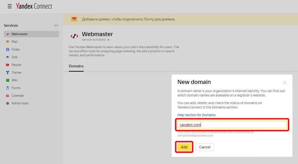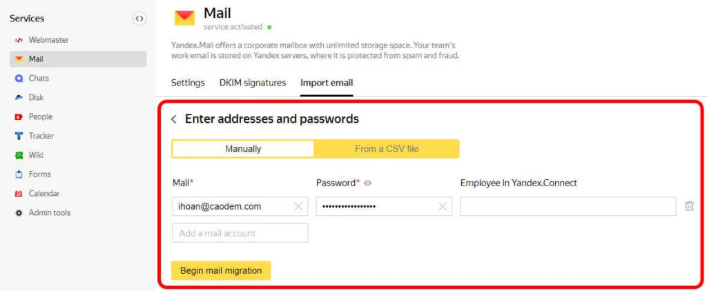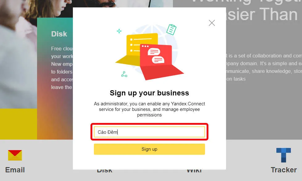 4. Nhập địa chỉ email tên miền riêng mà bạn đã tạo ở Yandex vào.