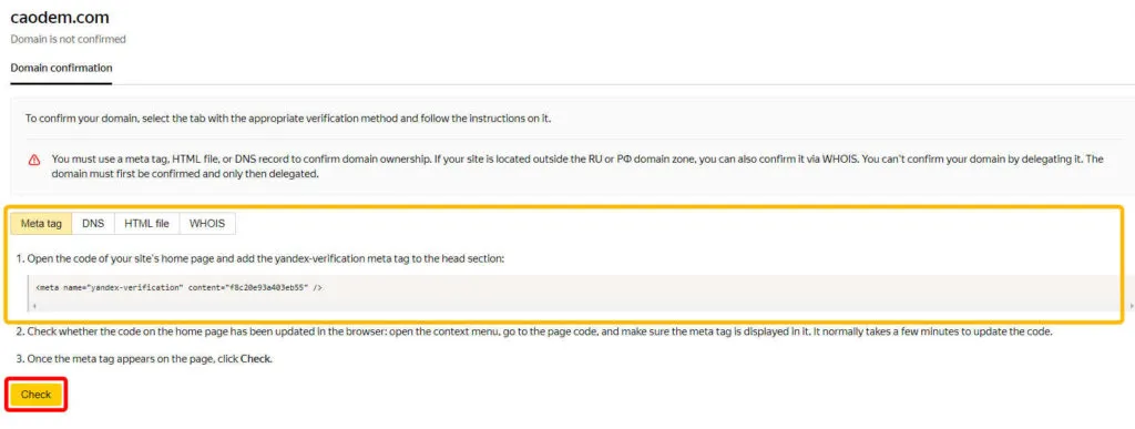 Sau khi đã gán được thông tin xác thực rồi thì nhấn Check để Yandex kiểm tra.