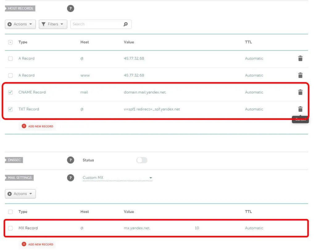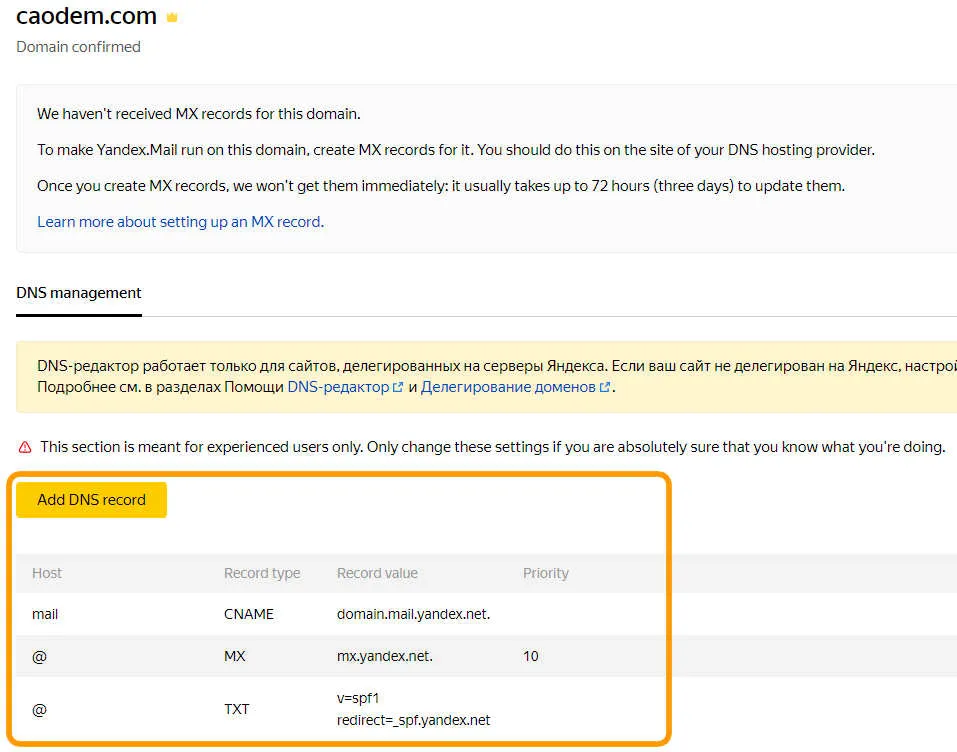 Truy cập vào trang quản lý DNS tên miền của bạn, và thêm 3 bản ghi mà bạn nhận được trước đó từ Yandex.