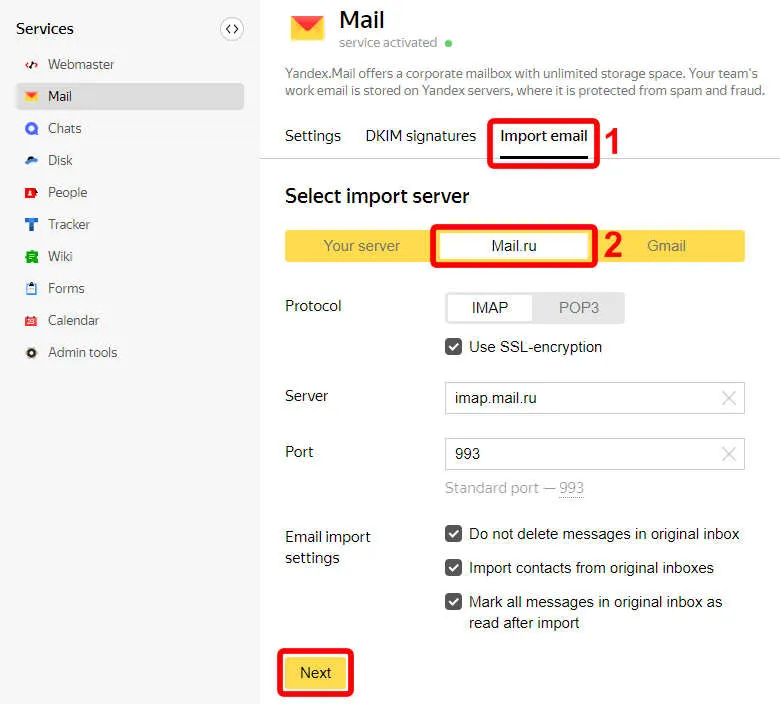 Chọn vào tab Import email > chọn vào máy chủ Mail.ru > rồi nhấn Next.