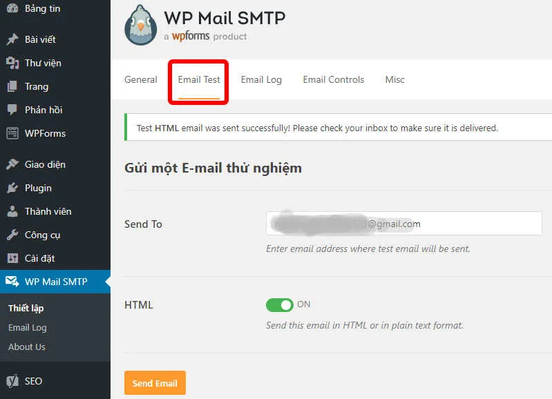 Sau khi thiết lập xong, bạn qua tab Email Test và thử gửi email đến một email bất kỳ và xem kết quả.